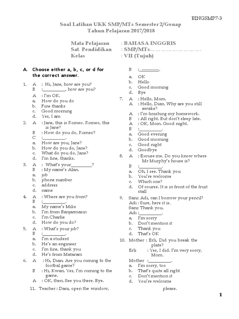 Soal Latihan Ukk Smp Mts Semester 2 Genap Tahun Pelajaran 2017 2018 Mata Pelajaran Bahasa Inggris Sat Pendidikan Smp Mts Kelas Vii Tujuh Room Home